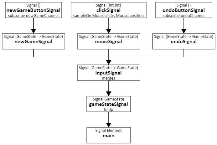 The first three functions create the basic input signals that are then transformed into other signals. The clickSignal function creates a signal which outputs the mouse pointer position on every click. The newGameButtonSignal function returns the signal associated with newGameMailbox. The undoButtonSignal function returns the signal associated with undoMailbox.